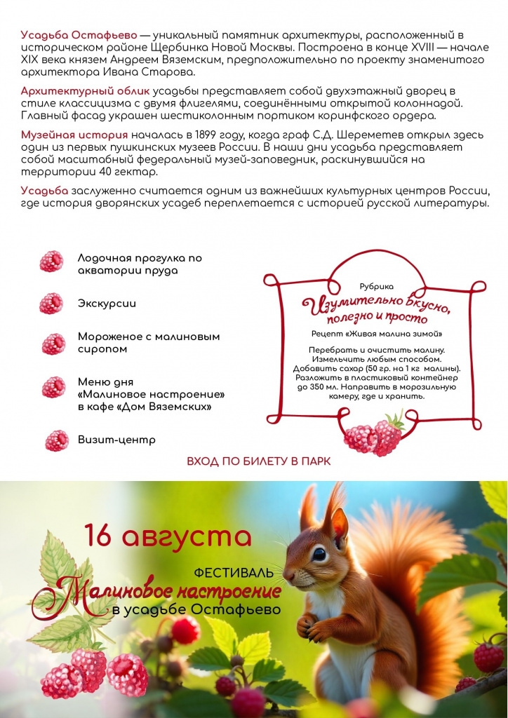 6 августа 2025 года в Государственном музее-заповеднике «Остафьево» - «Русский Парнас» состоится семейный фестиваль «Малиновое настроение в усадьбе Остафьево»