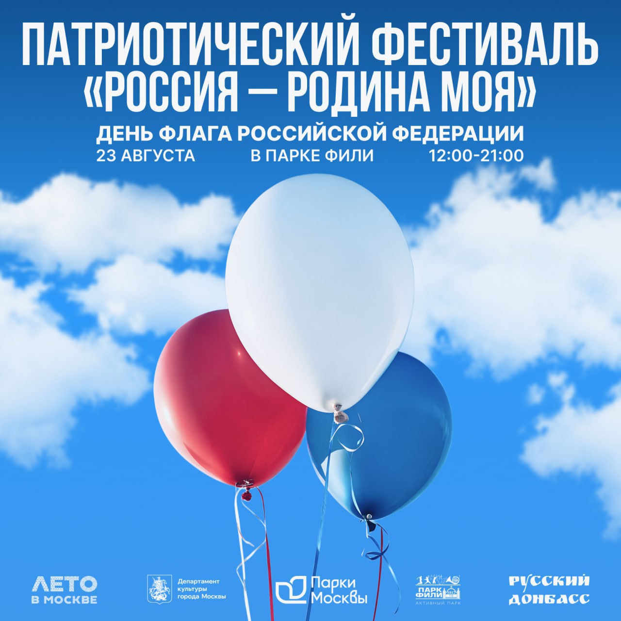 Мероприятие организовано Добровольческим Гуманитарным проектом «Русский Донбасс» при содействии и поддержки Государственного автономного учреждения культуры города Москвы «Парк культуры и отдыха «Фили» проводит патриотический Фестиваль «Россия – Родина Моя», приуроченный к празднованию Дня флага России.Фестиваль «Россия – Родина Моя» проводится для популяризации и узнаваемости ведомств и организаций стоящих на защите интересов России и связанных со служением Отечеству, развитию волонтёрских движений, укреплению духовных, культурных, и традиционных ценностей народов России, формированию желания, и готовности защищать свою страну.