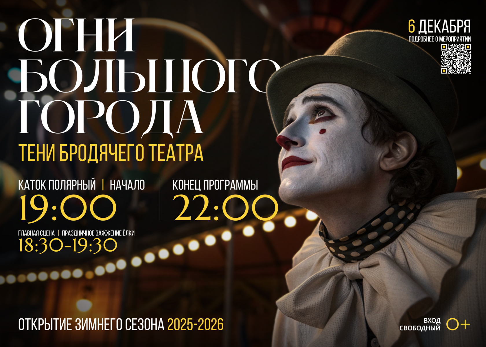«Огни большого города: Тени бродячего театра» – сочетание ледяного блеска, театрального волшебства и праздничного настроения.
