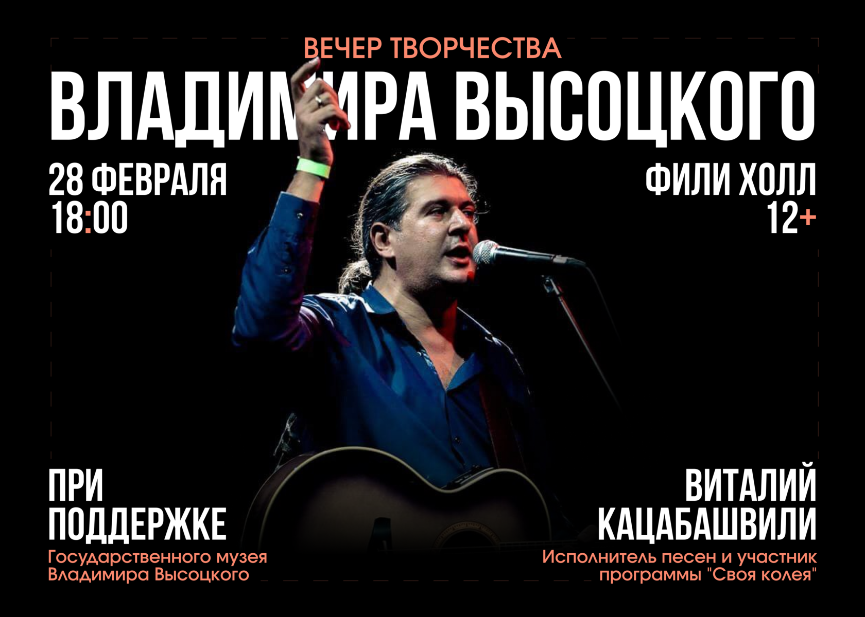 28 февраля 2026 года в 18:00 в парке Фили состоится концерт, посвященный творчеству и памяти выдающегося советского поэта, автора-исполнителя и актера Владимира Семеновича Высоцкого.